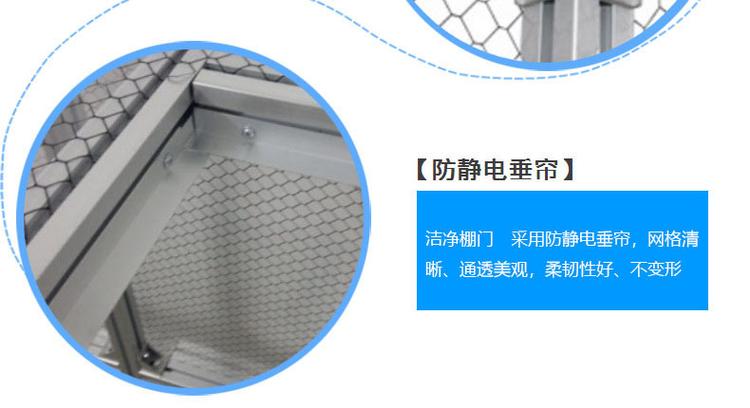 2.防靜電簾:四周采用防靜電簾(或鋼化玻璃),防靜電效果好,透明度高,網(wǎng)格清晰,柔韌性好,不變形,不易老化。